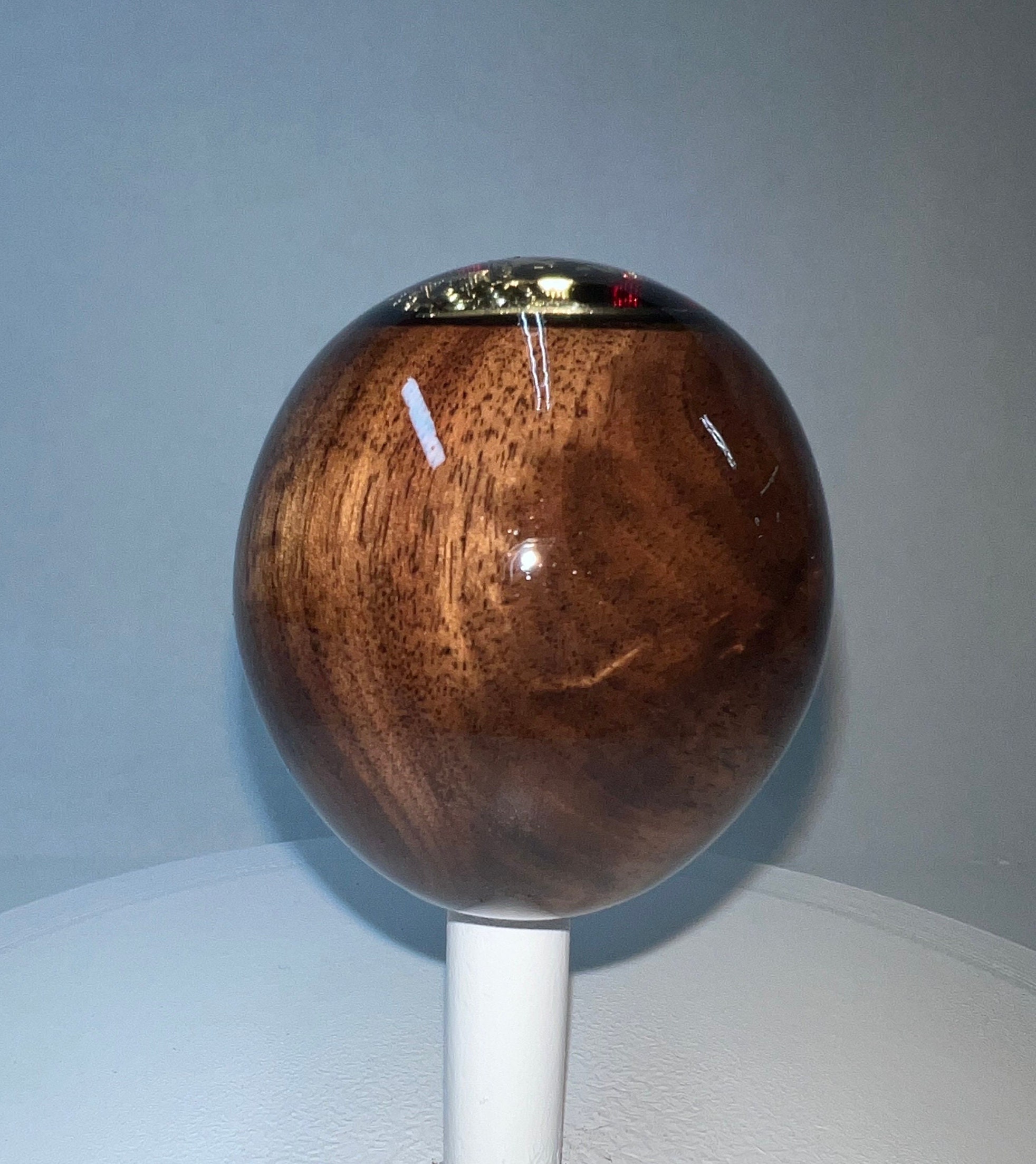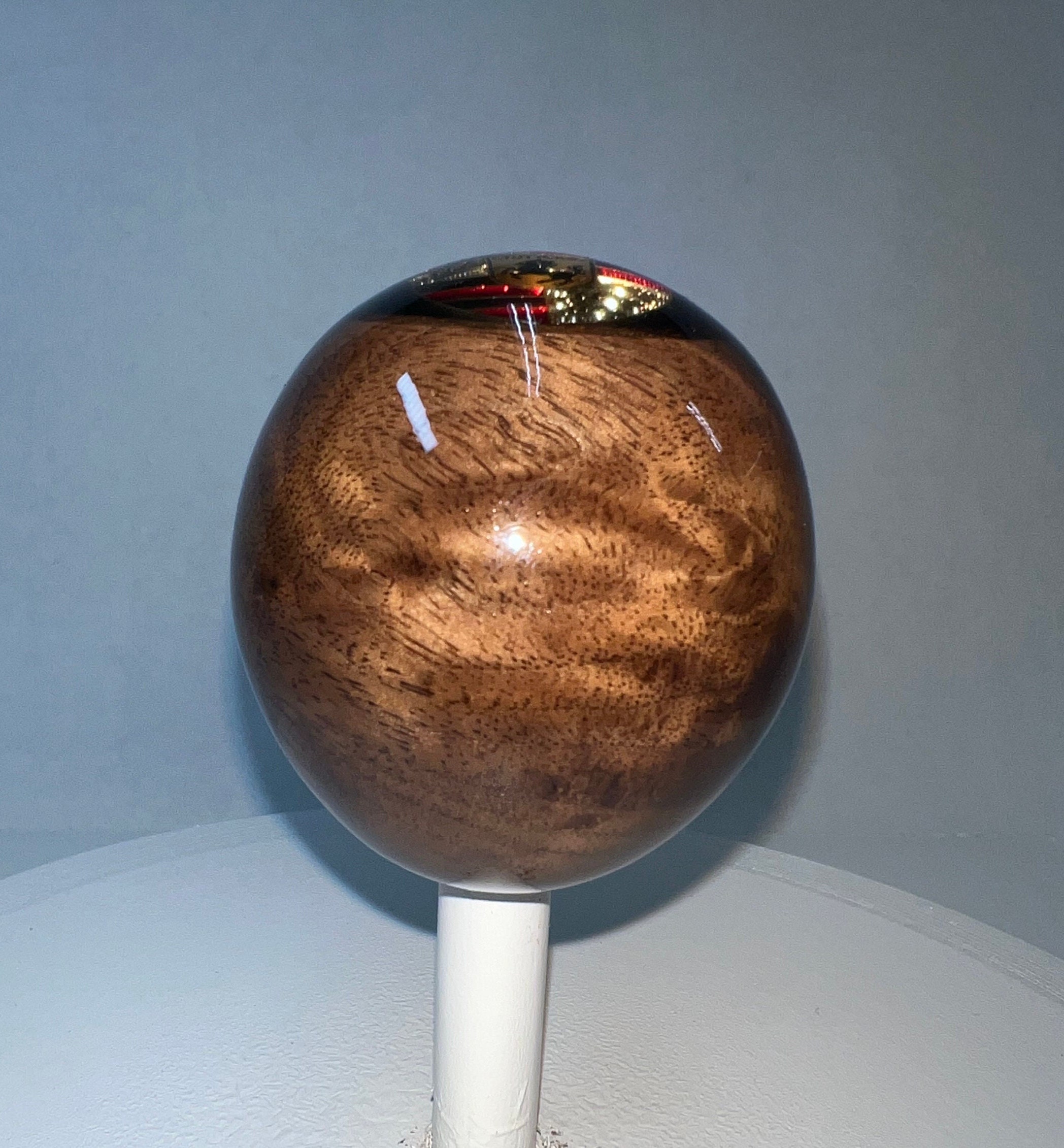 BW19-Figured Black Walnut with 8 coats gloss polyurethane finish. Enameled metal crest embedded in epoxy with black epoxy in background and clear epoxy on top. 53.2mm width. 57.1mm height. 14.5mm shaft opening.
